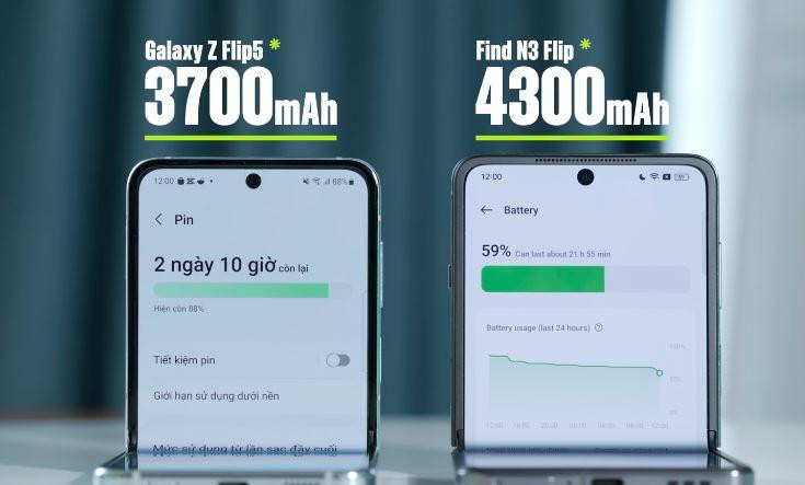 Tuy hiệu năng của Find N3 Flip kém hơn nhưng bù lại, Find N3 Flip có pin dung lượng cao hơn cũng như có sạc nhanh hơn so với Galaxy Z Flip5. Cụ thể pin OPPO dung lượng 4300mAh, hỗ trợ sạc nhanh Super VOOC 44W, trong khi đó, model của Samsung có pin 3700mAh kèm sạc nhanh 25W (Oppo chỉ mất khoảng 53 phút để sạc đầy pin, còn máy Samsung hết khoảng 76 phút). Sử dụng thực tế, N3 Flip có thời gian onscreen khoảng hơn 8 giờ, lâu hơn so với thời gian onscreen khoảng 7 giờ của Z Flip5.
