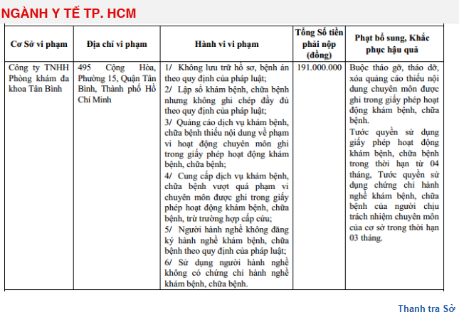 Trong đó, Công ty TNHH Phòng khám đa khoa Tân Bình (Phòng khám đa khoa Tân Bình, 495 Cộng Hoà, phường 15, quận Tân Bình, TP HCM) bị xử phạt 191 triệu đồng.