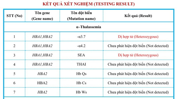 Kết quả xét nghiệm gen của bệnh nhân phát hiện đột biến gen dị hợp tử kép --SEA/-α3.7/Ảnh Medlatec