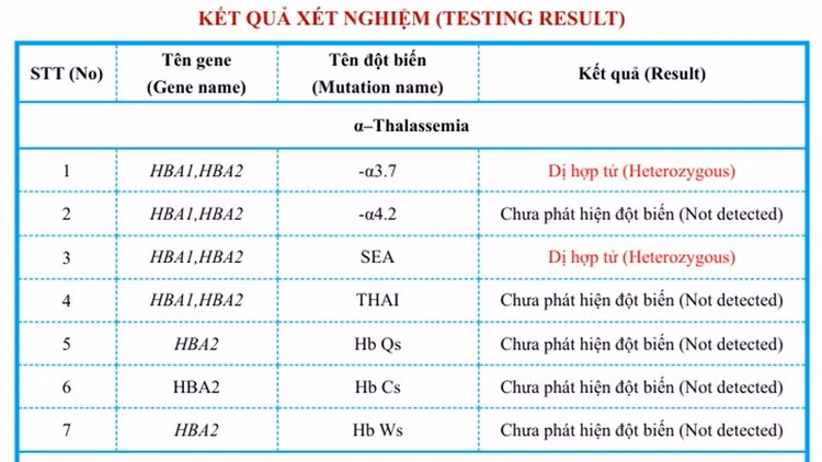 Kết quả xét nghiệm, sắt huyết thanh nằm trong giới hạn bình thường. Điện di huyết sắc tố phát hiện HbH và Hb Bart’s, đồng thời HbA2 giảm, gợi ý đến bệnh Thalassemia thể α (Alpha). Xét nghiệm gen phát hiện đột biến gen dị hợp tử kép --SEA/-α3.7 trong bệnh α-Thalassemia.
