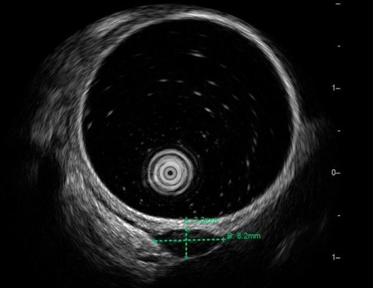 Kết quả cho thấy khối u kích thước khoảng 8,2 x 2,2mm, xuất phát từ lớp cơ trơn, ranh giới rõ, cấu trúc giảm âm đồng nhất, không vôi hóa, không chảy máu. Các đặc điểm này gợi ý nhiều đến u cơ trơn lành tính, nhưng vẫn chưa loại trừ GIST, một tổn thương khác nguy cơ cao hơn.