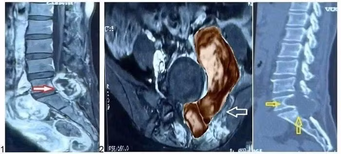 Kết quả chụp MRI tại Bệnh viện Nhân dân 115 cho thấy khối u lớn vùng L5-S1, xâm lấn cơ cạnh sống, cánh chậu và phúc mạc, đúng vị trí phẫu thuật cũ - nghi ngờ ác tính.