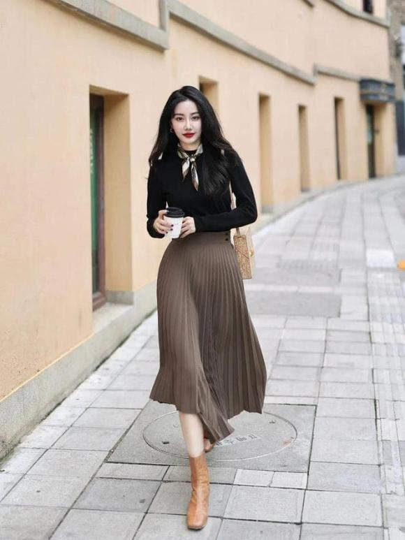Một item khác chính là áo len dáng thụng có gam màu sáng, nhẹ nhàng. Hòa quyện với đó là nét thướt tha, duyên dáng của chân váy dài xếp ly. Tất cả tạo nên sự thanh lịch nhưng cũng không kém phần nổi bật.
