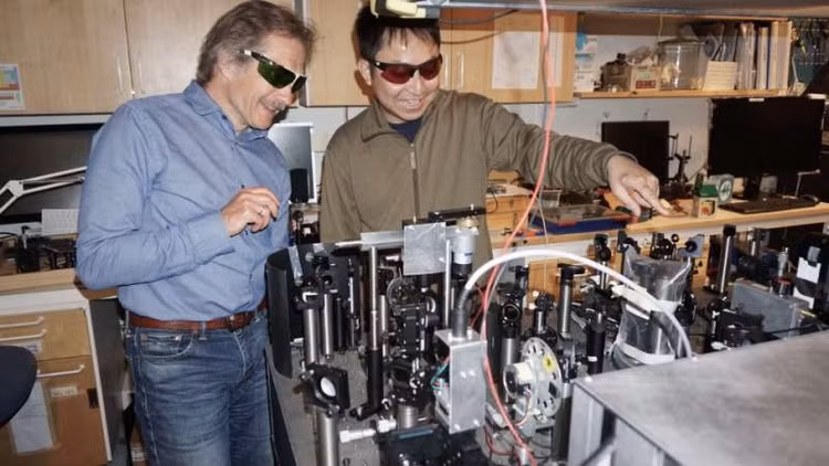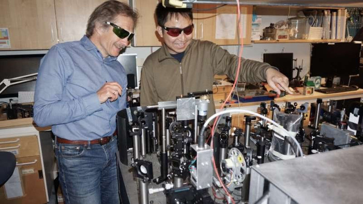 TS Tönu Pullerits và nhà nghiên cưu Kaibo Zheng thiết lập quang phổ laser, sử dụng trong nghiên cứu. Ảnh Pavel Chabera