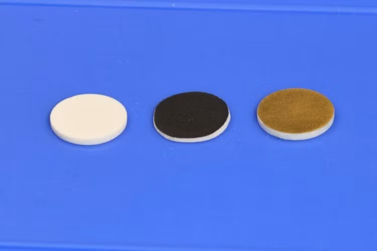 Đĩa kiểm tra pin điện phân rắn được sử dụng để thử nghiệm phương pháp xử lý của nhóm nghiên cứu với pin điện phân rắn. Ở bên trái, một mẫu chất điện phân rắn, một vật liệu được gọi là LLPO. Ảnh: Pjotrs Žguns