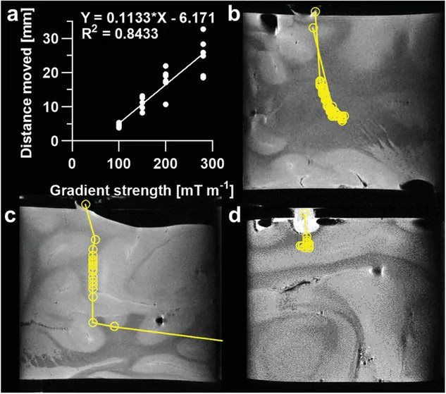 Hình ảnh MRI trong mô não heo ex-vivo cho thấy đường đi của một hạt từ tính 3 mm được điều hướng bằng máy MRI (các đường màu vàng).