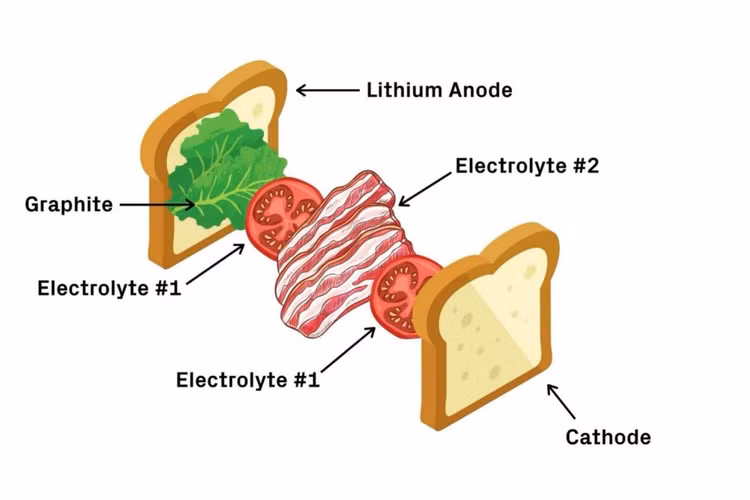 Cấu trúc của pin tương tự như một chiếc bánh sandwich BLT. Trước hết là miếng bánh mì - cực dương kim loại liti - tiếp theo là rau diếp - một lớp phủ than chì, sau đó là lớp cà chua - chất điện phân đầu tiên, lớp thịt xông khói - chất điện phân thứ hai. Kết thúc là một lớp cà chua khác và miếng bánh mì cuối cùng - cực âm. Ảnh: Lisa Burrows / Harvard SEAS