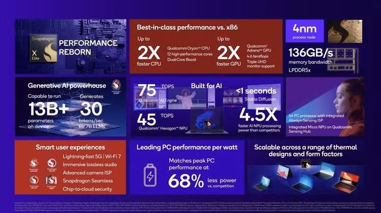 Điều này là một bước tiến lớn so với M2 của Apple với hiệu suất tối đa là 16 TOPs. Qualcomm cho biết SoC mới nhất này có thể tập trung vào Gen AI đòi hỏi nhiều tài nguyên trong khi vẫn duy trì hiệu suất làm mát và tối ưu pin.