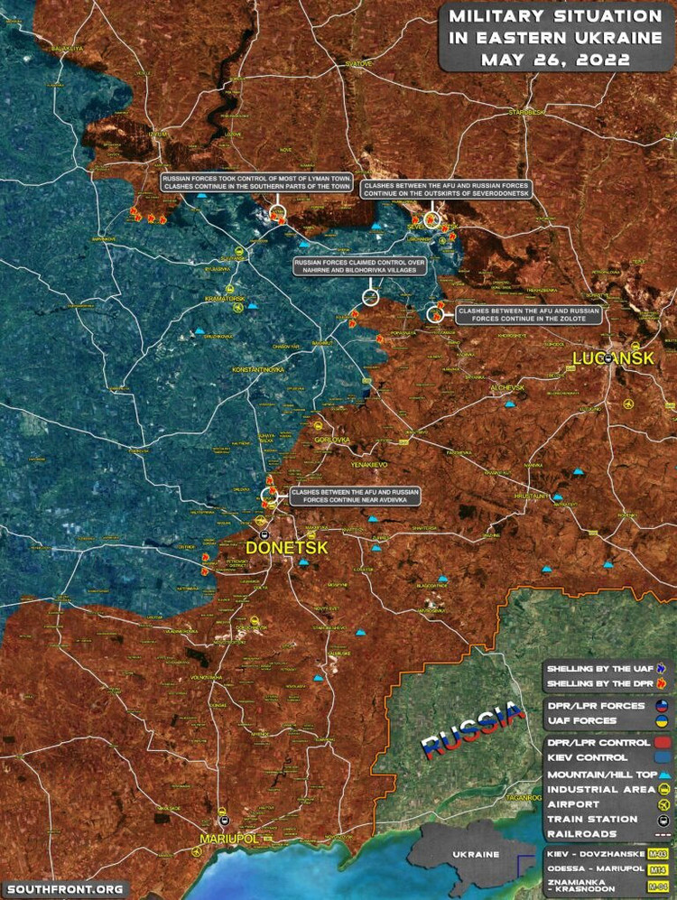 Trên chiến trường khu vực Luhansk, giao chiến tiếp diễn trên vùng ngoại ô Severodonetsk. Các lực lượng dân quân Donbass và quân đội Nga tiến vào chiến tuyến quân đội Ukraine trong thành phố từ các làng Voevodovka và Shchedrishchevo.