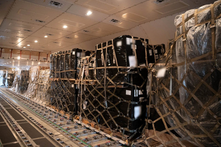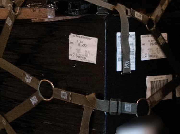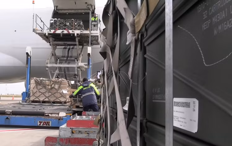 Không quân Mỹ công bố những bức ảnh, ghi lại những đống đạn vũ khí bộ binh mới, cùng với súng phóng lựu trong một chiếc Boeing 747, sau khi máy bay hạ cánh xuống Sân bay Quốc tế Boryspil.