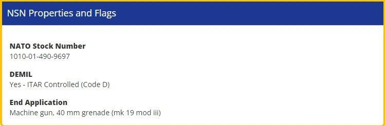 Theo Sổ tay Phân loại Nguồn cung cấp Đa ngôn ngữ NATO và Danh mục Tên mặt hàng (ACodP-2), được giới thiệu trong Bộ Quốc phòng Ukraine với tên gọi “Bộ phân loại Nguồn cung cấp Thông thường”, mã NSN tương ứng là 1010-01-490-9697 đối với một mặt hàng cung cấp là "Súng máy, 40mm, MK19 Mod III", hoặc súng phóng lựu tự động 40mm Mark 19 Mod 3.