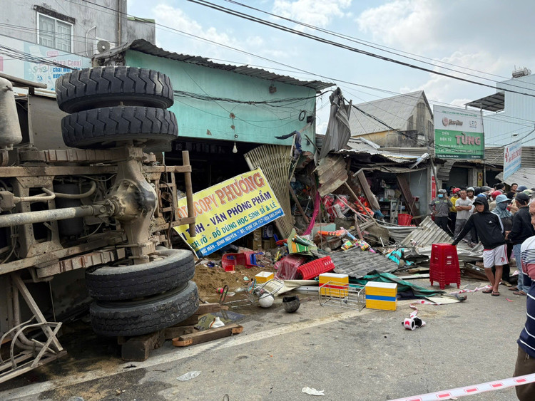 Tại hiện trường, xe tải biển kiểm soát 76H-026.17 lật nghiêng, phía đuôi xe một xe máy bị mắc kẹt bên dưới thùng. Gần đó có nhiều xe máy khác nằm chỏng chơ, nhiều nhà dân bị "bóc" mái hiên. Phía đầu xe, một nạn nhân là phụ nữ bị đè nửa thân dưới.