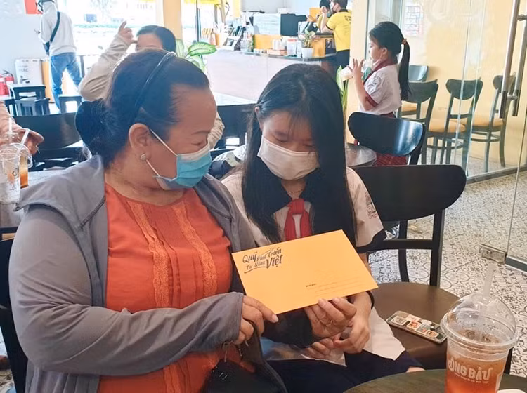 Hai bác cháu Bảo Thy vui mừng khi nhận được học bổng từ Cà phê Ông Bầu.
