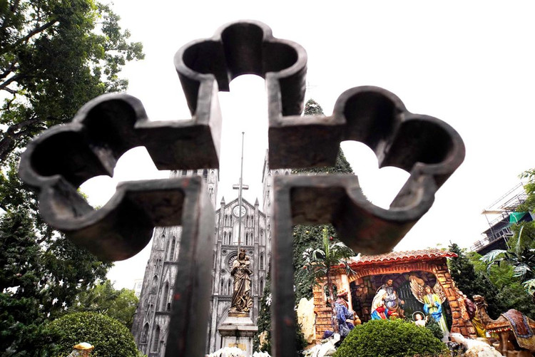 | Cây thông Noel cao khoảng 10m được trang trí rực rỡ tại Nhà Thờ Lớn Hà Nội trên phố Lý Quốc Sư. |