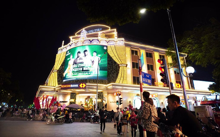 | Các trung tâm thương mại, trụ sở doanh nghiệp trang trí đèn led rực rỡ trên nhiều tuyến phố Hà Nội. |