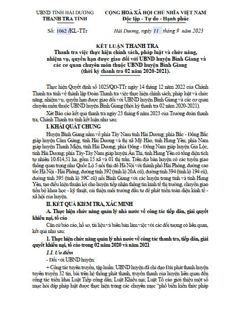 Từ những hạn chế, thiếu sót trên, Thanh tra tỉnh Hải Dương kiến nghị Thanh tra huyện, Trưởng ban Tiếp công dân huyện, các phòng: Tài nguyên và Môi trường, Tài chính và Kế hoạch, Kinh tế và Hạ tầng huyện tổ chức kiểm điểm làm rõ trách nhiệm, có hình thức xử lý phù hợp đối với tập thể, cá nhân liên quan.