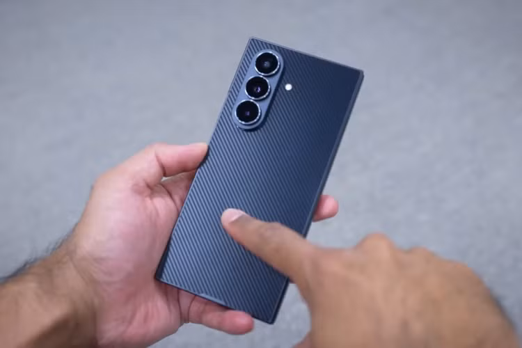 Mặt lưng của Galaxy Z TriFold được hoàn thiện từ chất liệu Fibreglass Composite (Nhựa gia cường sợi thuỷ tinh) với hoạ tiết tựa vân carbon chìm. Điều này tạo cho máy một cái nhìn rất hầm hố và chắc chắn (dù bản chất đây vẫn là chất liệu nhựa). Mặt lưng cũng là nơi có sự xuất hiện của cụm 3 camera với thiết kế và vị trí tương đồng như trên Galaxy Z Fold7.