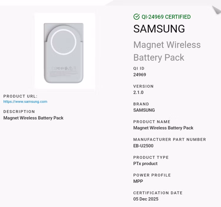 Sạc dự phòng mới mang tên Samsung Magnetic Wireless Battery Pack vừa xuất hiện trong cơ sở dữ liệu của WPC, sở hữu chứng nhận Qi2 và thiết kế vòng nam châm ở mặt lưng.