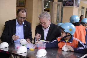 Đại diện Quỹ FIA và Quỹ AIP tham gia hoạt động tô mũ bảo hiểm với học sinh.