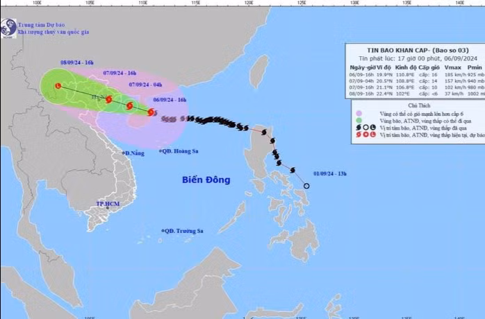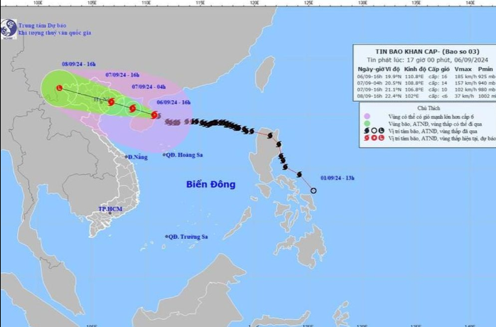 Hiện tại cơn bão số 3 ở cấp siêu bão (cấp 16, giật trên cấp 17). Vị trí lúc 10h trưa nay của bão số 3 ở vào khoảng 19,3 độ Vĩ Bắc; 112,0 độ Kinh Đông, cách đảo Hải Nam (Trung Quốc) khoảng 130 km về phía Đông Đông Nam; cách Quảng Ninh khoảng 570km về phía Đông Đông Nam, di chuyển theo hướng Tây, tốc độ 15-20km/h.