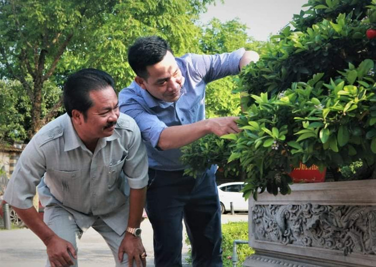Nhà báo Vương Xuân Nguyên (bên trái) trao đổi về nghệ thuật tạo hình cây cảnh nghệ thuật của người Việt