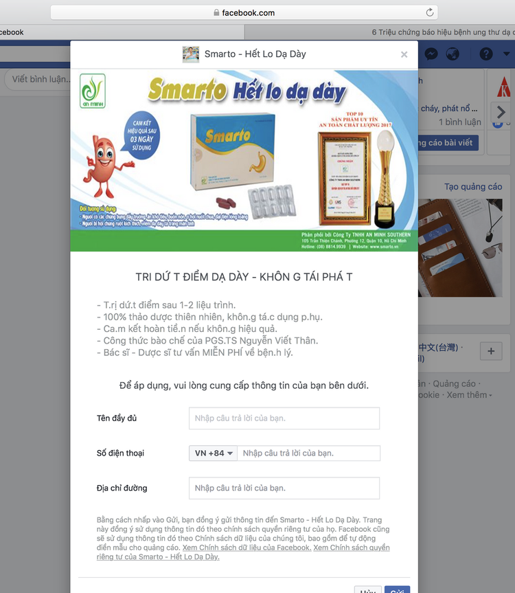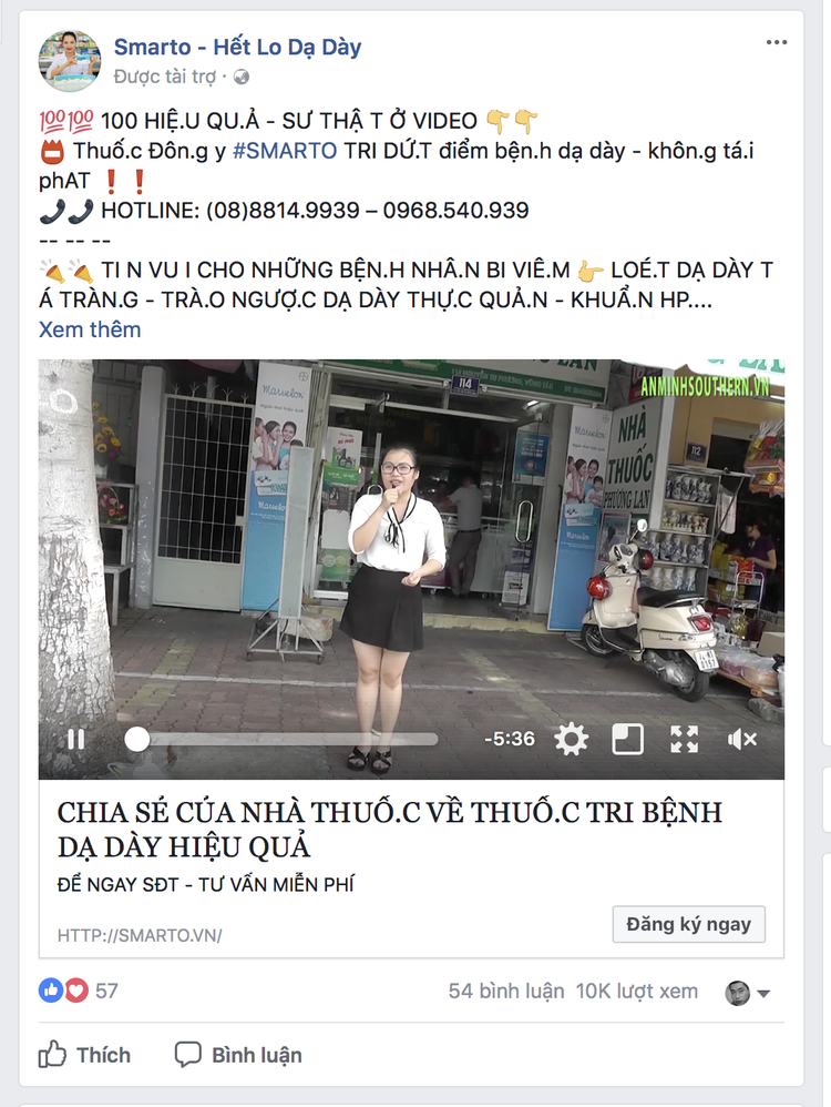 Cụ thể, trên trang facebook Smarto – Hết lo dạ dày, Công ty TNHH An Minh Southern tung hàng loạt video giới thiệu các nhà thuốc bán sản phẩm Smarto. Quảng cáo có gắn link Smarto.vn. Khi khách hàng click vào link này sẽ thấy hiện ra hình ảnh Smarto – Hết lo dạ dày, kèm lời giới thiệu: “Trị dứt điểm dạ dày – không tái phát”. Dưới dòng chữ này tiếp tục là thông tin nhấn mạnh: “Trị dứt điểm bệnh dạ dày sau 1 – 2 liệu trình”, “Công thức bào chế của PGS.TS Nguyễn Viết Thân”… Tiếp đến là ô để bệnh nhân nhập tên tuổi, số điện thoại, địa chỉ nhận hàng.