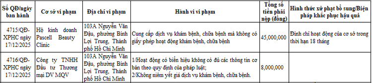 Cụ thể, Hộ kinh doanh Pascell Beauty Clinic, địa chỉ 103A Nguyễn Văn Đậu, phường Bình Lợi Trung, TP HCM bị Sở Y tế TP HCM xử phạt 45 triệu đồng và đình chỉ hoạt động của cơ sở trong thời hạn 18 tháng theo Quyết định số 4715/QĐ-XPHC ngày 17/12/2025 do cung cấp dịch vụ khám bệnh, chữa bệnh mà không có giấy phép hoạt động khám bệnh, chữa bệnh.