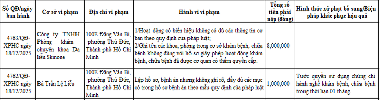 Sở Y tế TP HCM cũng đã xử phạt Công ty TNHH Phòng khám Chuyên khoa Da liễu Skinone (địa chỉ 100E Đặng Văn Bi, phường Thủ Đức, TP HCM) 8 triệu đồng theo Quyết định số 4763/QĐ-XPHC ngày 18/12/2025 do hoạt động có biển hiệu không có đủ các thông tin cơ bản theo quy định của pháp luật; ghi tên các khoa, phòng trong cơ sở khám bệnh, chữa bệnh không đúng với hồ sơ giấy phép hoạt động khám bệnh, chữa bệnh đã được cơ quan có thẩm quyền cấp.