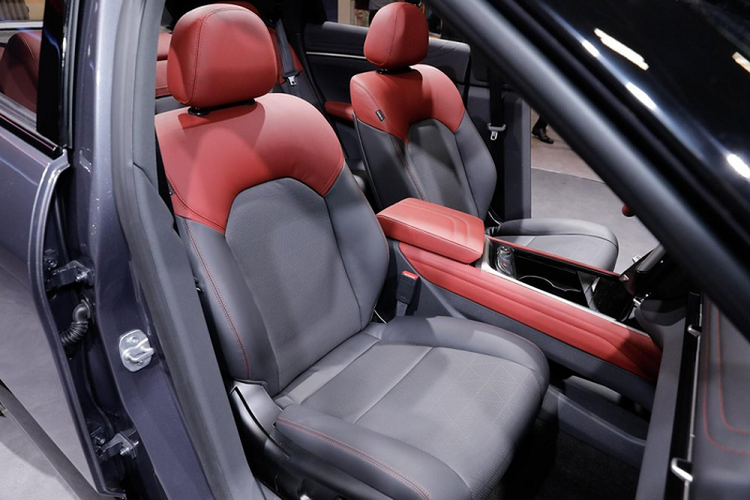 Qua những hình ảnh chụp tại triển lãm Ô tô Paris 2022, có thể thấy VinFast VF7 được trang bị nội thất có thiết kế thể thao hơn so với người anh em VF6. Có được điều đó là nhờ vô lăng vát đáy thể thao và bọc da phối 2 màu xám - đỏ tương phản, tương tự ghế trước/sau của xe.