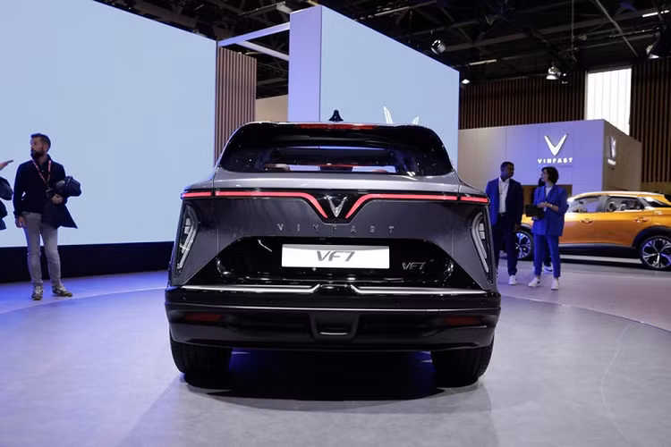 Đằng sau, VinFast VF7 được trang bị dải đèn LED hình chữ "V" giống phía trước. Bên cạnh đó, mẫu SUV điện này còn có cụm đèn nằm dọc cỡ lớn ở hai góc đuôi xe, cánh gió mui tích hợp đèn phanh trên cao và 2 nẹp màu bạc trên cản sau giống cản trước.