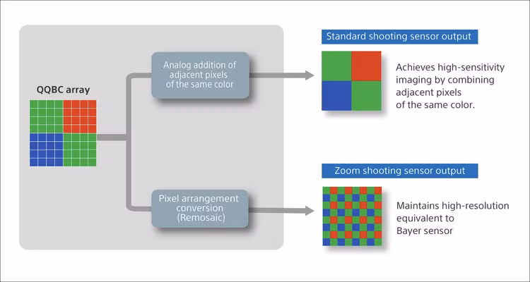Mỗi pixel có kích thước 0.7 micromet, phù hợp với đặc điểm của các cảm biến 200 MP hiện hành. Sony sử dụng cấu trúc Quad Quad Bayer mở rộng ma trận điểm ảnh và xử lý remosaic bằng phần cứng chuyên dụng, giúp tái tạo màu sắc chính xác và giảm thiểu nhiễu trong quá trình dịch thuật dữ liệu.