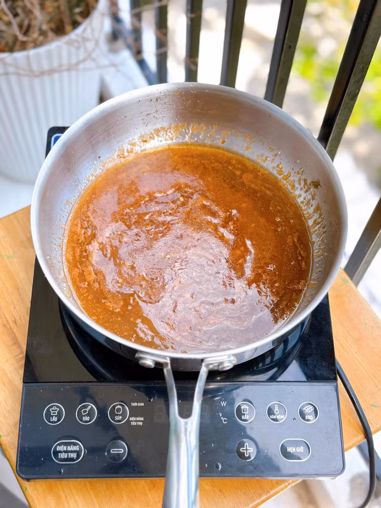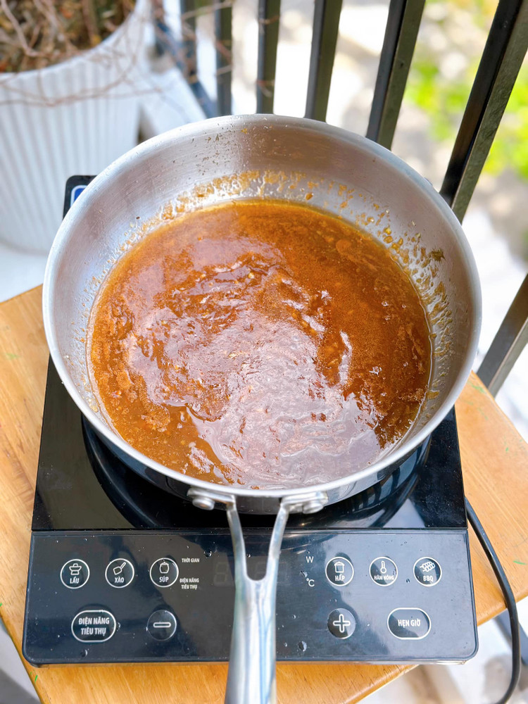 - Dùng lại chảo cho tỏi và gừng vào phi thơm, nếu ăn cay được thì thêm ớt. tiếp đến cho nước cốt me + tương cà và đường vào đun sôi nêm nếm lại cho vừa ăn.