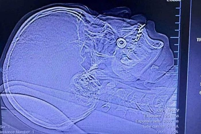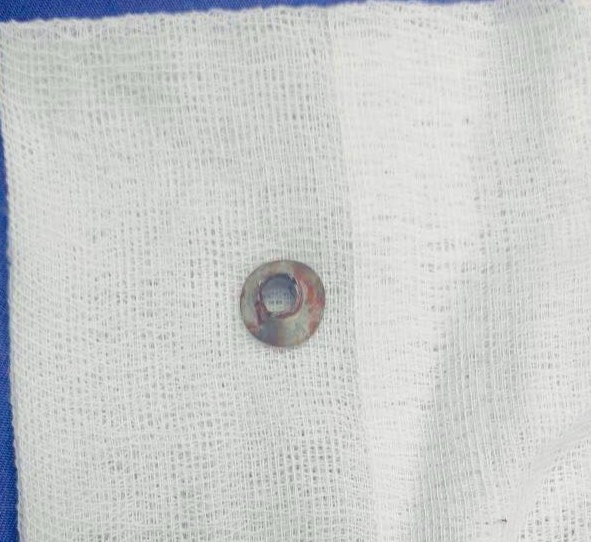 Kết quả chụp chiếu cho thấy dị vật kim loại hình tròn cắm sâu trong phần mềm vùng má phải, gây rạn cung tiếp xương gò má. Nhận định đây là ca phức tạp, nguy cơ biến chứng cao, các bác sĩ đã hội chẩn liên khoa và quyết định phẫu thuật.