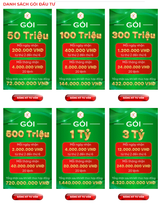 Cụ thể hơn, doanh nghiệp này đưa ra các gói đầu tư từ 50 triệu đồng đến 5 tỷ đồng để các nhà đầu tư lựa chọn.