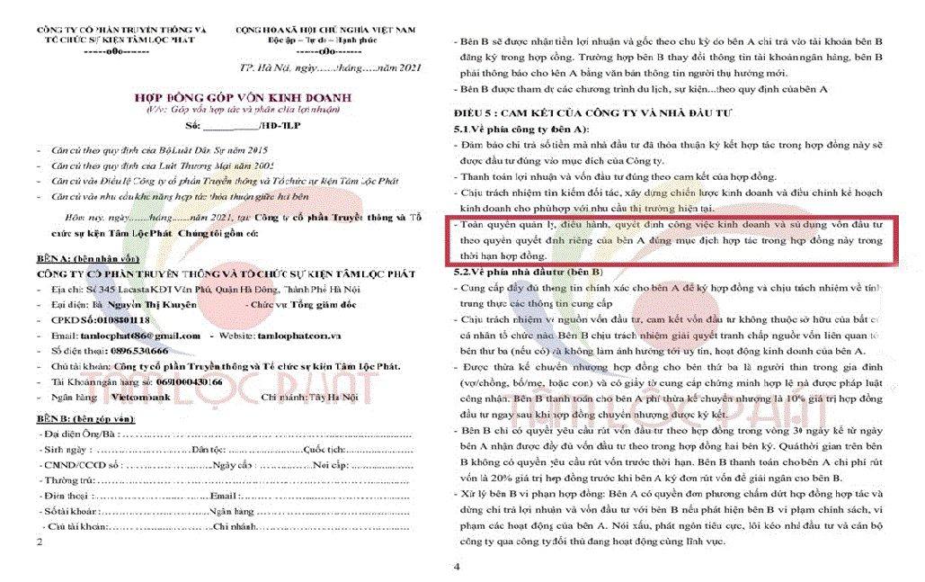 Cụ thể, theo điều 5.1, trách nhiệm của nhà đầu tư là góp tiền, còn trách nhiệm của Tâm Lộc Phát là đưa tiền đấy đi kinh doanh và trả lãi cho nhà đầu tư.