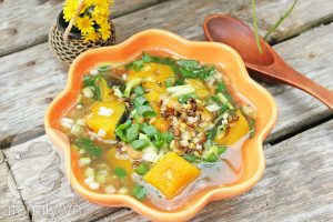 Bí đỏ hầm đậu phộng: Bí đỏ 400g, sườn thăn 400g, đậu phộng (lạc) 50g, xì dầu 2 muỗng canh, tỏi bằm 2 muỗng cà phê đường, muối, tiêu. Nấu thành canh ăn.