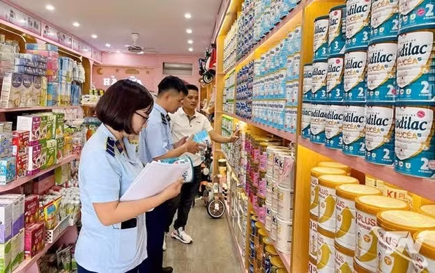 Cán bộ Đội Quản lý thị trường số 5 kiểm tra cửa hàng kinh doanh sữa/Ảnh DMS