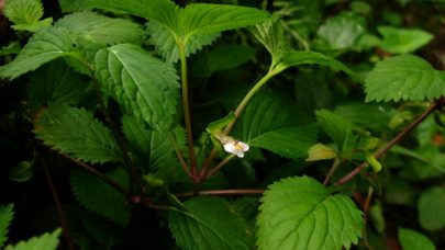 Lá mọc đối, hình trái xoan hoặc hình trứng, dài 3 – 5 cm, rộng 2 – 3 cm, tròn ở gốc, hơi nhọn ở đầu, mép có khía răng đều, gân phụ 4 – 5 cặp, có lông mịn; cuống lá đôi khi hơi có cành.