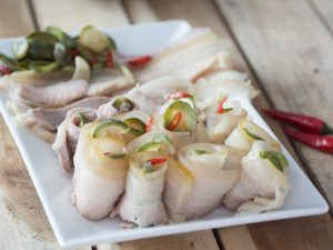 Thịt ba chỉ cuộn sấu: thịt ba chỉ thái mỏng, sấu và tỏi thái lát, ớt thái chỉ. Xếp sấu, tỏi, ớt vào miếng thịt ba chỉ thái mỏng và cuộn lại, chấm với mắm nêm hoặc mắm tôm chua.