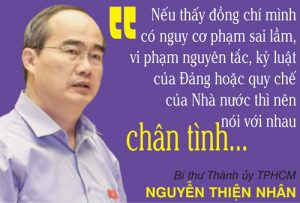 “Phải xử lý kỷ luật như vậy rất là đau, rất là buồn, nhưng khi có sai sót thì phải đánh giá công bằng và phải xử lý kỷ luật… Thời gian tới, nếu thấy đồng chí mình có nguy cơ phạm sai lầm, vi phạm nguyên tắc, kỷ luật của Đảng hoặc quy chế của Nhà nước thì nên nói với nhau chân tình, đừng để đến mức bị kỷ luật rồi mới ngồi lại với nhau, mới nói lại… Bởi không có ai vi phạm mà chỉ có một mình, bao giờ cũng có người khác biết, thậm chí tham gia việc đó. Bài học ở đây là cố gắng trao đổi sớm với nhau” – Bí thư Thành ủy TP HCM Nguyễn Thiện Nhân. tuoitre.vn ngày 2/12