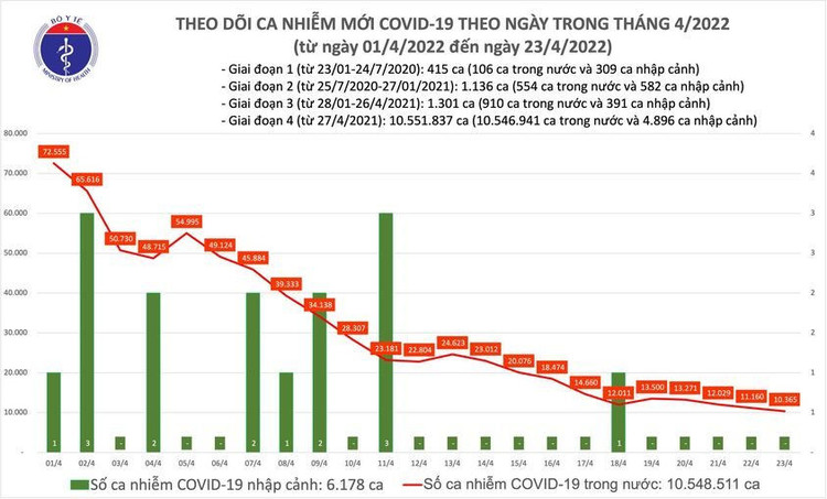 Bản tin Bộ Y tế về tình hình chống dịch Covid-19 tại Việt Nam cho biết: Tính từ 16h ngày 22/4 đến 16h ngày 23/4, trên Hệ thống Quốc gia quản lý ca bệnh COVID-19 ghi nhận 10.365 ca nhiễm mới, trong đó 0 ca nhập cảnh và 10.365 ca ghi nhận trong nước (giảm 795 ca so với ngày trước đó) tại 59 tỉnh, thành phố (có 7.412 ca trong cộng đồng).