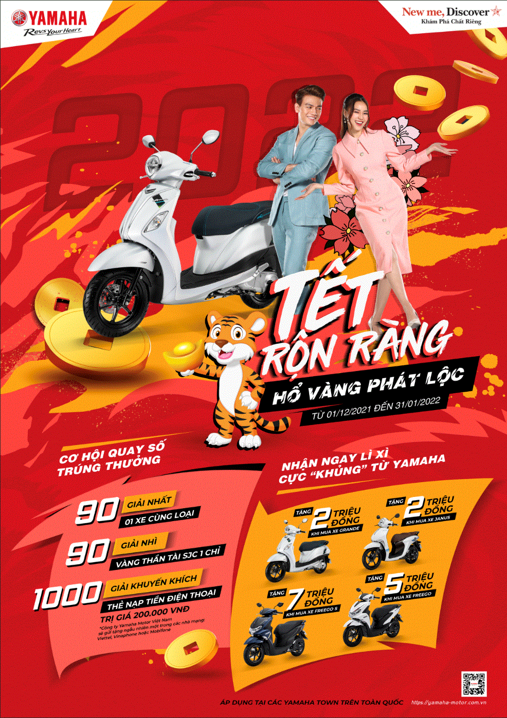 Trong cuối năm 2021, nhà sản xuất xe máy Nhật Bản - Yamaha Motor đã giới thiệu nhiều phiên bản mới dành cho một số dòng xe “hot” trên thị trường. Theo đó, từ ngày 1/12/2021 - 31/1/2022, Yamaha tung ra chương trình khuyến mại hấp dẫn mang tên: “Tết rộn ràng - Hổ vàng phát lộc” với những ưu đãi đặc biệt dành cho khách hàng như sau: Tặng ngay 2 triệu đồng khi mua Yamaha Grande hoặc Yamaha Janus; Tặng ngay 7 triệu đồng khi mua Yamaha Freego S; Tặng ngay 5 triệu đồng khi mua Yamaha Freego.