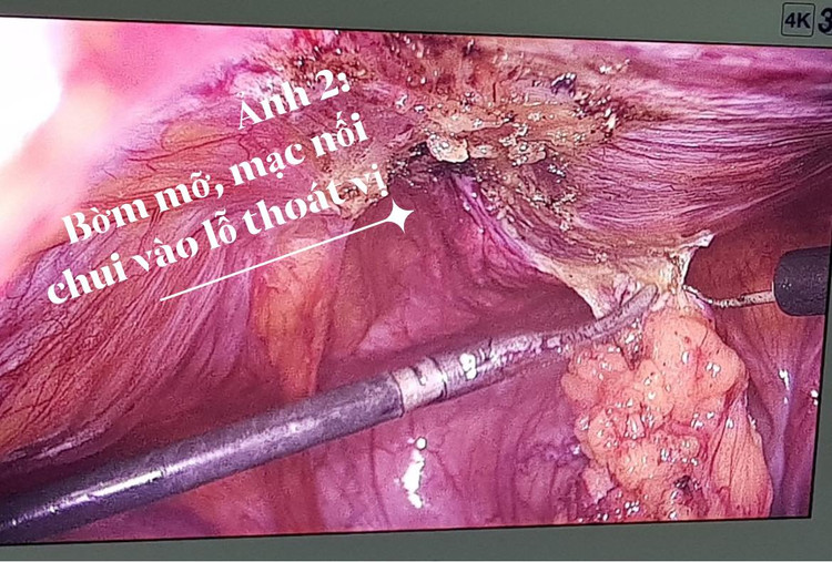 Hình ảnh nội soi cho thấy rõ tổ chức mạc nối và bờm mỡ đang chui vào một lỗ thoát vị trên thành bụng. Phải rất vất vả, các bác sĩ mới gỡ được tổ chức mạc nối và bờm mỡ này ra khỏi lỗ thoát vị để tránh cho bệnh nhân biến chứng hoại tử tổ chức nguy hiểm.