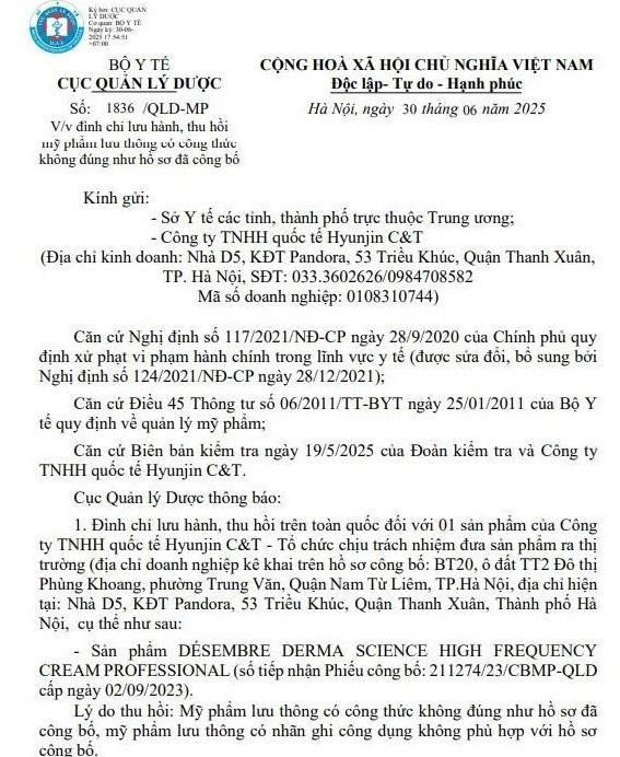 Công văn số 1836/QLD-MP, ngày 30/6 của Cục quản lý Dược về đình chỉ lưu hành, thu hồi mỹ phẩm Désembre Derma Science High Frequency Cream Professional - Ảnh chụp màn hình