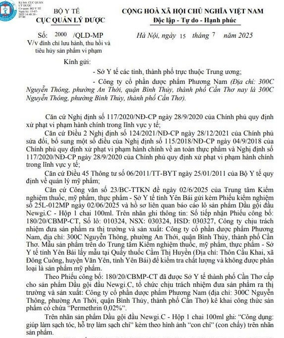 Cục cũng đề nghị Sở Y tế thành phố Cần Thơ giám sát Công ty Cổ phần Dược phẩm Phương Nam thực hiện thu hồi lô sản phẩm Dầu gội đầu Newgi.C - Hộp 1 chai 100ml không đáp ứng quy định. Kiểm tra Công ty Cổ phần Dược phẩm Phương Nam trong việc chấp hành các quy định của pháp luật về quản lý mỹ phẩm trong hoạt động sản xuất, kinh doanh mỹ phẩm. Xử lý, xử phạt vi phạm theo quy định hiện hành và báo cáo kết quả về Cục Quản lý Dược trước ngày 25/8/2025.