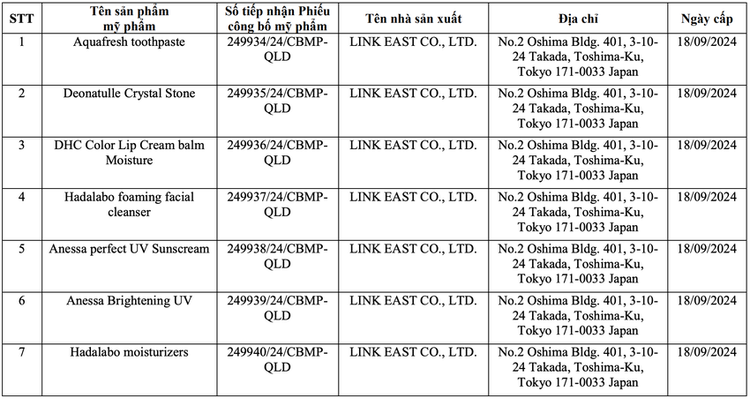 Cụ thể, Cục Quản lý Dược thu hồi 32 số tiếp nhận Phiếu công bố sản phẩm mỹ phẩm do Cục Quản lý Dược cấp đối với sản phẩm mỹ phẩm do Doanh nghiệp chịu trách nhiệm đưa sản phẩm ra thị trường là Công ty TNHH JP-Bùi Đặng (địa chỉ số 54 Khu tập thể In- May 19/5 Bộ công an, đường 19/5, Phường Văn Quán, Quận Hà Đông, TP Hà Nội). Link East Co., Ltd (No.2 Oshima Bldg. 401, 3-10- 24 Takada, Toshima-Ku, Tokyo 171-0033 Japan) là đơn vị sản xuất.
