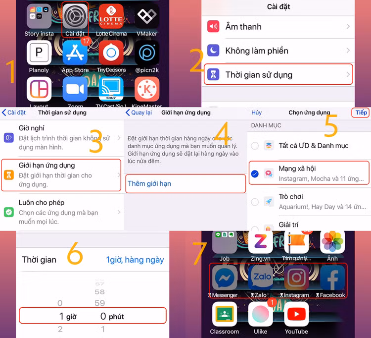 Cài đặt > Thời gian sử dụng > Giới hạn ứng dụng > Thêm giới hạn > Chọn danh mục ứng dụng muốn giới hạn > Giới hạn thời gian sử dụng./.