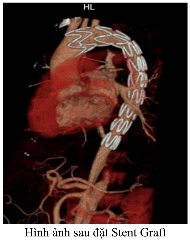 Ngay sau đó, Stent Graft đã được các bác sĩ can thiệp cẩn thận đặt từ ngay phía sau động mạch thân cánh tay đầu xuống động mạch chủ ngực giữ cho động mạch chủ không bị lóc tách, đồng thời nhờ phẫu thuật bắc cầu nối từ trước tưới máu não vẫn được đảm bảo một cách đầy đủ, chỉ cần một vết rạch 2 cm ở vị trí đùi phải, tránh cho bệnh nhân được một cuộc phẫu thuật mở ngực vô cùng nguy hiểm. Sau can thiệp bệnh nhân phục hồi tốt và xuất viện sau 7 ngày điều trị.