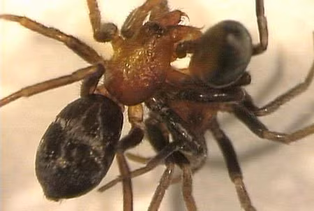 Nhện lưng đỏ Australia cái sẽ ăn thịt “bạn tình” của mình trong lúc giao phối, nhện lưng đỏ đực gần như không thể chạy thoát khỏi nhện cái.