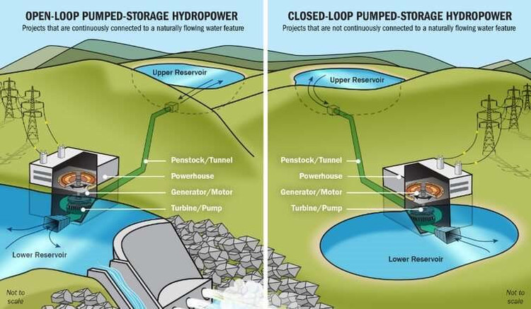 Trong những ngày nắng, gió, dư thừa điện tái tạo, nước được bơm lên hồ chứa phía trên để lưu trữ. Ban đêm hoặc khi thiếu nắng, gió, nước được xả chảy ngược lại qua các tuabin để cung cấp năng lượng tích trữ.